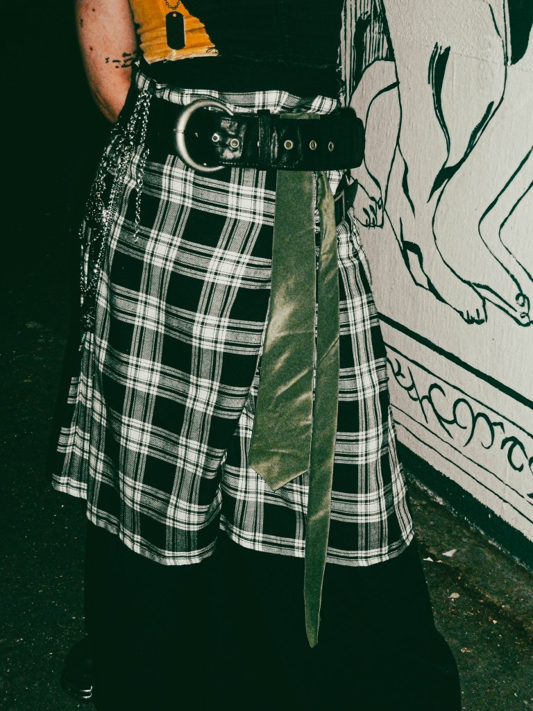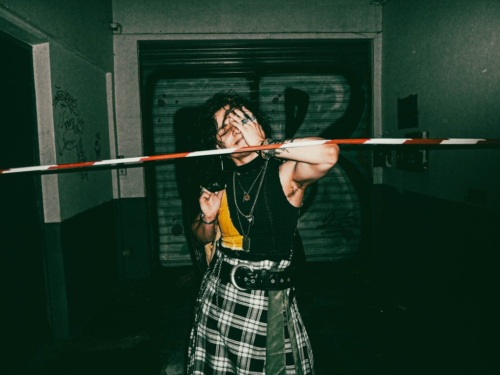 His shirt—handcrafted, torn like a battle flag—whispers stories of rebellion. Ripped jeans and a rugged kilt clash in fearless defiance,